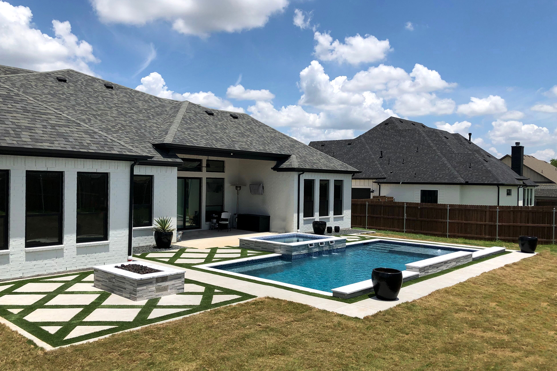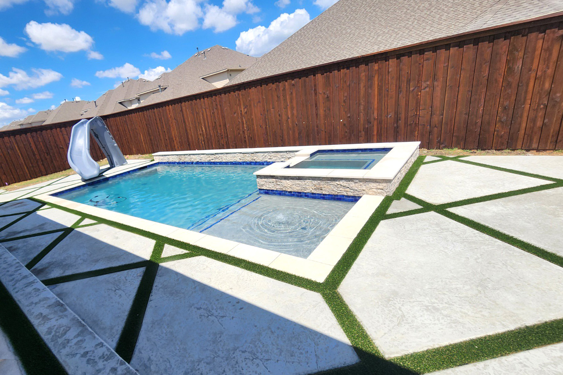 - Water features will more likely be sheer descents, rain descents, laminar or deck jets, or vanishing edge, water/fire bowls.